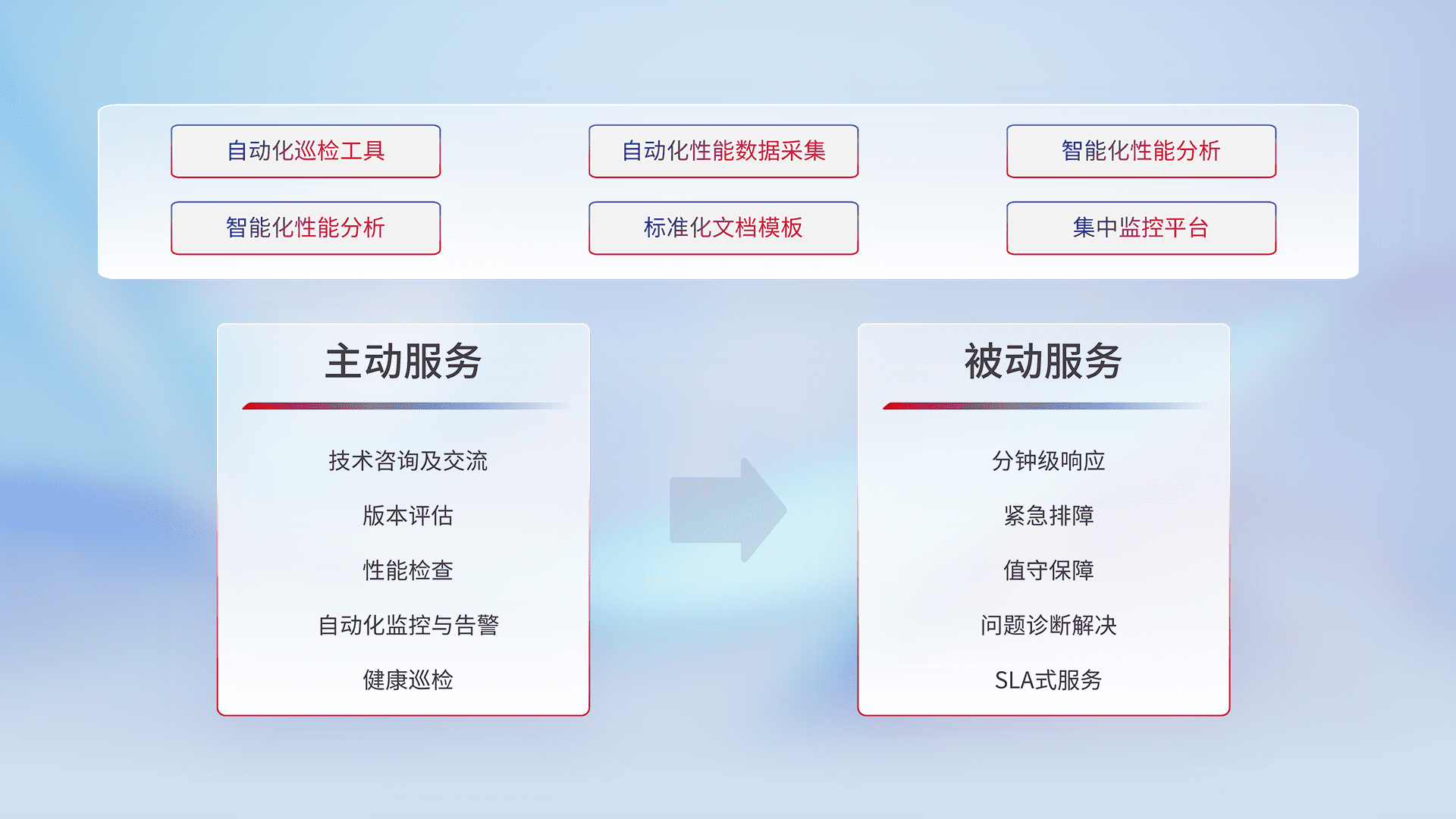 智能化工具和标准化文档,,,保障服务质量,,,提供主动服务(包含技术咨询、、版本评估、、、、性能检查、、、、自动化监控与告警、、、健康巡检)和被动服务包含(分钟级响应、、、紧急排障、、、值守保障、、、、问题诊断解决、、、、SLA服务)。。。